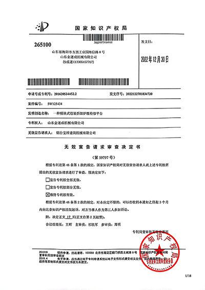 煙臺(tái)寶梓建筑機(jī)械有限公司抄襲的專(zhuān)利(專(zhuān)利號(hào):201820409444.4),于2021年02月01日被國(guó)家知識(shí)產(chǎn)權(quán)局專(zhuān)利復(fù)審委員會(huì)宣告專(zhuān)利權(quán)全部無(wú)效。該公司惡意提起無(wú)效山東金道成機(jī)械有限公司有關(guān)專(zhuān)利的申請(qǐng),經(jīng)過(guò)國(guó)家知識(shí)產(chǎn)權(quán)局專(zhuān)利復(fù)審委員會(huì)的有關(guān)審查程序,根據(jù)《專(zhuān)利法》第46條第1款的規(guī)定,于2022年12月30日對(duì)我公司兩項(xiàng)專(zhuān)利做出宣告專(zhuān)利權(quán)全部有效的審查決定。