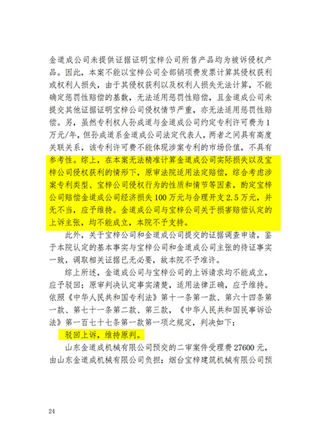 關(guān)于煙臺寶梓建筑機械有限公司侵犯山東金道成機械有限公司專利權(quán)的判決