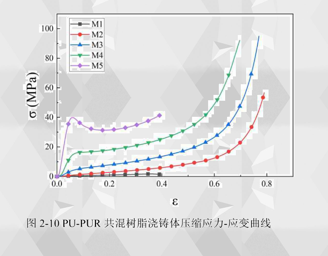 PU-PUR共混樹脂澆鑄體的壓縮應(yīng)力-應(yīng)變曲線如圖2-10所示,可以看出,M4和M5聚脲樹脂澆鑄體在應(yīng)力-應(yīng)變曲線上出現(xiàn)了明顯的線彈性階段和屈服階段。在應(yīng)變達(dá)到0.39的時(shí)候M1聚氨酯和M5聚脲樹脂澆鑄體都已經(jīng)處于變形失效的狀態(tài),聚氨酯澆鑄體發(fā)生扭曲變形失效,聚脲澆鑄體發(fā)生脆性斷裂失效。而共混樹脂澆鑄體M2、M3和M4在應(yīng)變達(dá)到0.5以上時(shí)才開始逐漸失效且擁有更長(zhǎng)的平臺(tái)段,失效應(yīng)變分別為0.64、0.59和0.51。說明在應(yīng)變率較大的情況下,M2、M3和M4樹脂澆鑄體的壓縮力學(xué)性能 要強(qiáng)于單獨(dú)的M1聚氨酯和M5聚脲,可以承擔(dān)更大的壓縮位移而不失效。