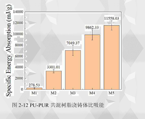 壓縮彈性模量表現(xiàn)材料在壓縮荷載作用下彈性變形的能力大小,反應出材料發(fā)生彈性變形的難易程度。從圖2-11(a)中得到,樹脂澆鑄體的壓縮彈性模量隨著聚脲組分的增 加而不斷增加,這和拉伸彈性模量的增加趨勢一致。M1聚氨酯的壓縮彈性模量數(shù)值較低,為4.83MPa。M2樹脂澆鑄體的壓縮彈性模量為14.70MPa,相比聚氨酯增加了204.35%。M3樹脂澆鑄體的壓縮彈性模量為34.03MPa,相比M2增加了131.50%。M4樹脂澆鑄體的壓縮彈性模量為248.43MPa,相比M3增加了630.03%。可以看出,M3的壓縮彈性模量增幅很大,在聚脲所占比例達到50%后,彈性模量的提升更加明顯,說明此時聚脲成分在樹脂澆鑄體中占據(jù)主要作用,支撐起了材料的結(jié)構(gòu),使得樹脂澆鑄體抵抗彈性變形的能力得到極大增強。M5聚脲的壓縮彈性模量最高,為832.54MPa。壓縮強度表示材料抵抗壓縮載荷而不失效的能力,在聚脲組分占混合樹脂的比例不斷增加的過程中,材料的塑性特征越來越明顯,其壓縮強度也不斷增強。從圖2-11(b)中得到M1聚氨酯的壓縮強度較低,為1.71MPa。M2樹脂澆鑄體的壓縮強度為13.31MPa,相比比聚氨酯增加了678.36%。M3樹脂澆鑄體的壓縮強度為34.88MPa,相比M2增加了162.06%。M4的壓縮強度為42.65MPa,相比M3增加了22.28%。M5聚脲的壓縮強度為42.09MPa。可以看出,在聚脲所占比例在50%以下的時候,樹脂澆鑄體壓縮強度增加非常明顯,而聚脲所占比例在50%以上的時候,其壓縮強度增加有限,M3、M4和M5的壓縮強度較為接近且大于M1和M2樹脂澆鑄體,M4和M5壓縮強度最高且相差很小。